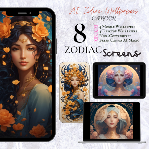 AI Zodiac Screens [Mobile & Desktop/Laptop]: Bundle of 8 Non-Copyrighted wallpapers - Cancer!