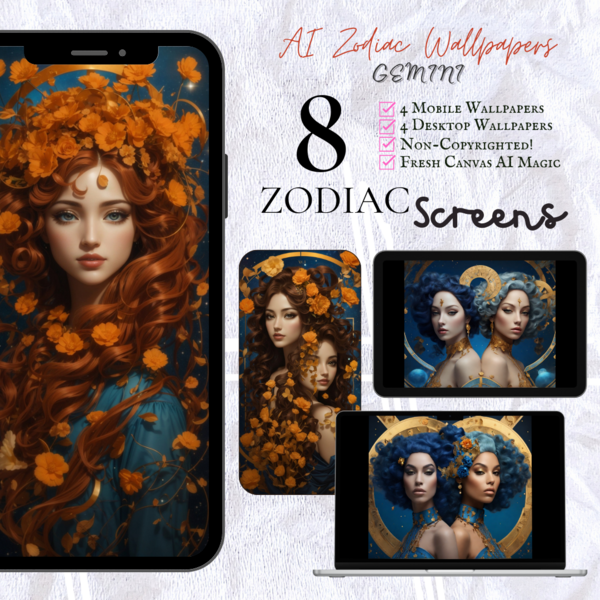 AI Zodiac Screens [Mobile & Desktop/Laptop]: Bundle of 8 Non-Copyrighted wallpapers - Gemini!
